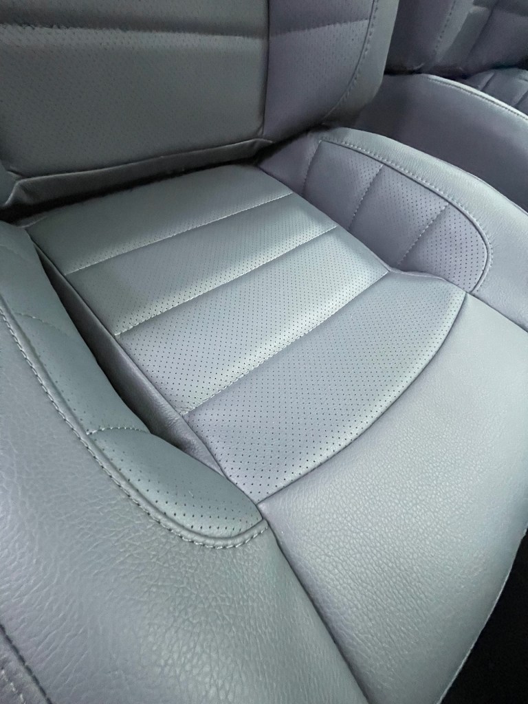 L’intérieur est en cuir gris et en cuir gris perforé.