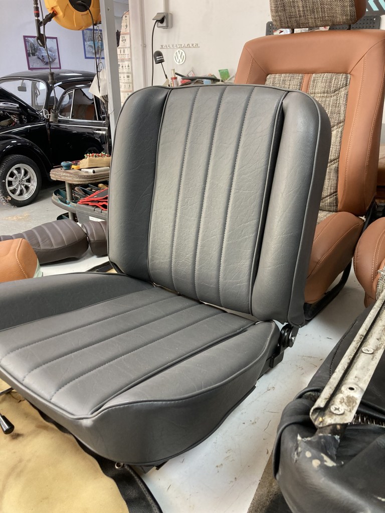 À l’atelier de la Sellerie Saintes Colombes des selleries sont prêtes pour nos clients : siège Alfa Romeo 2600 Touring, sièges Coccinelle 1968 , selles moto et Vespa.