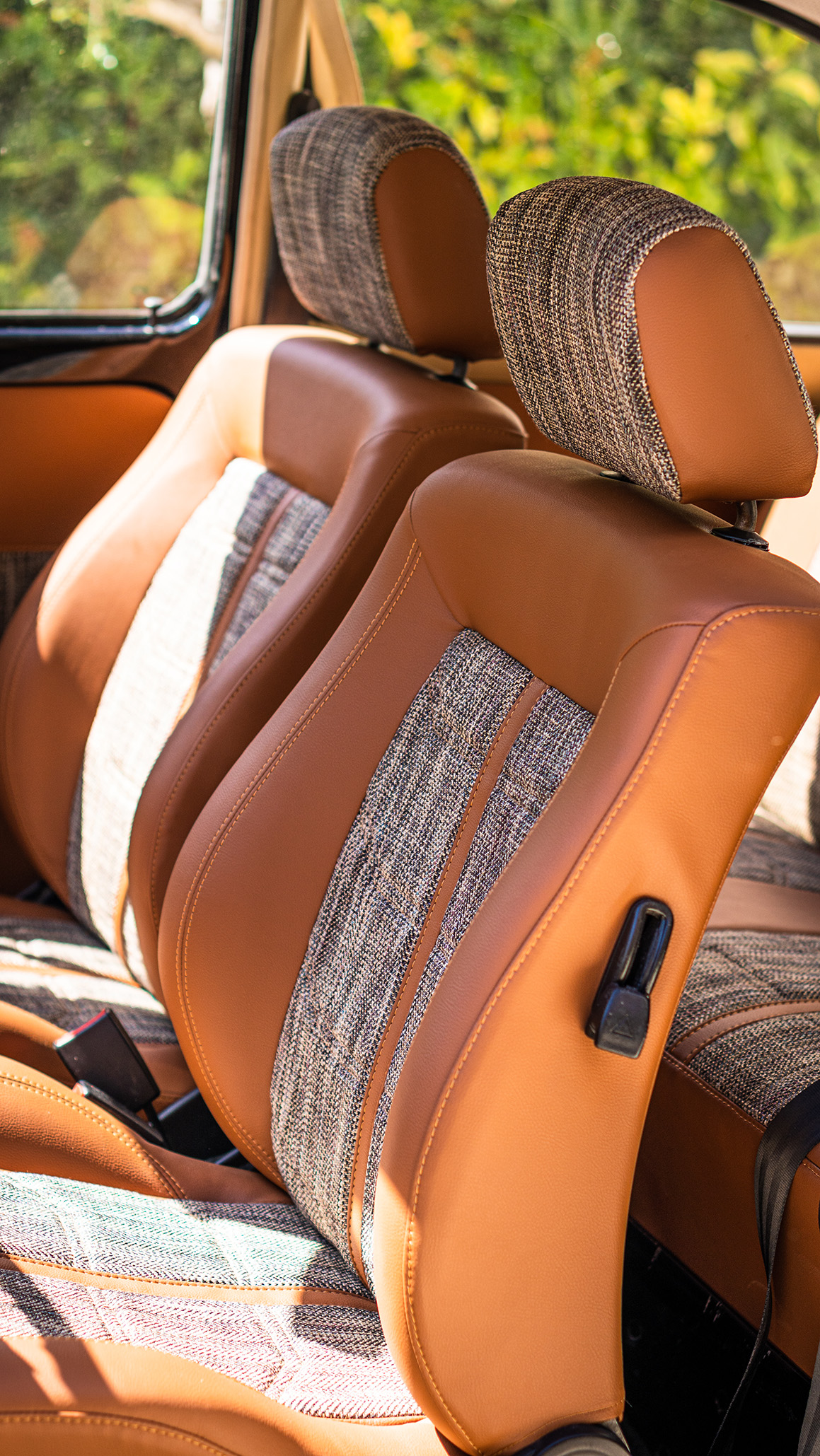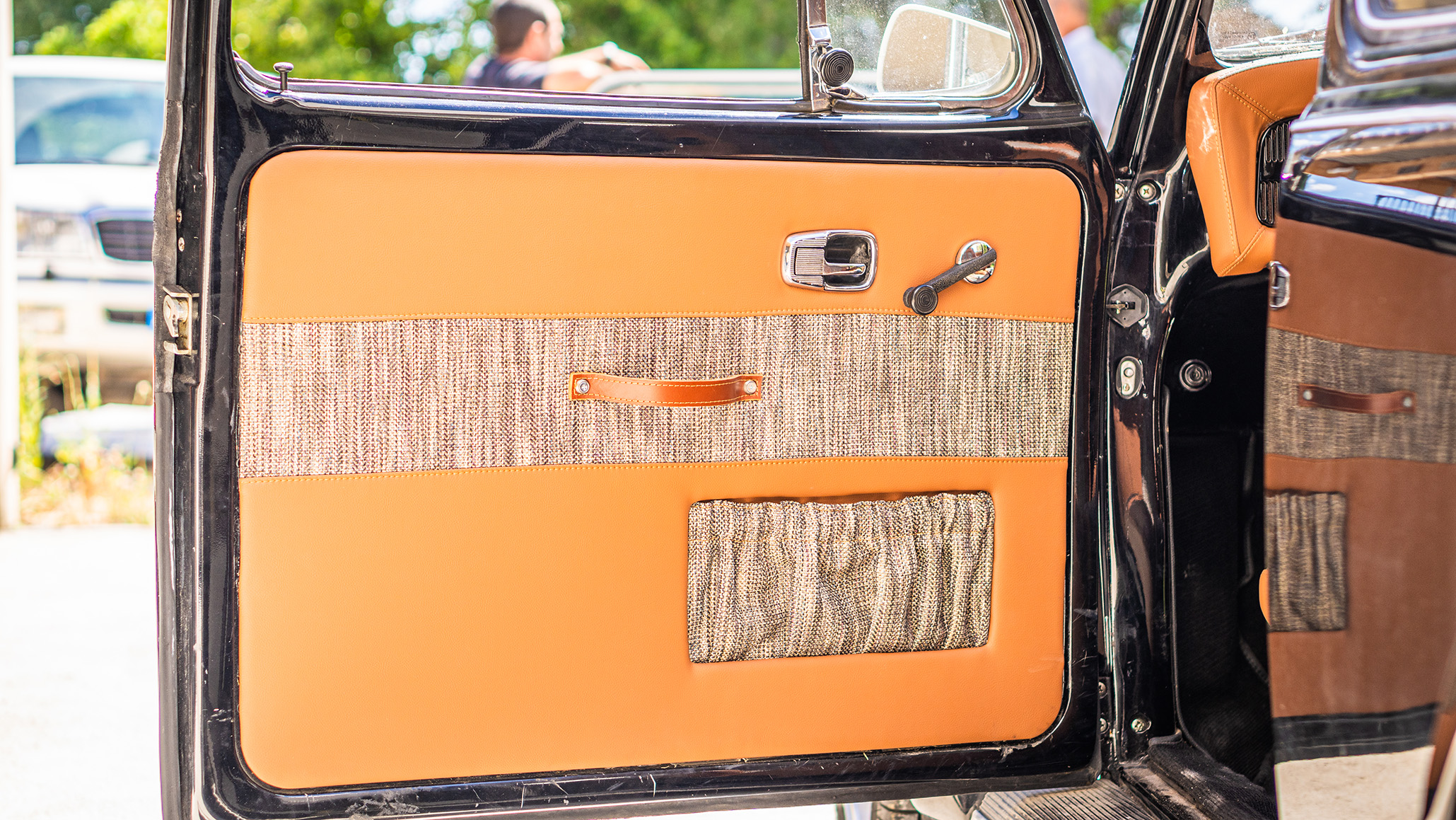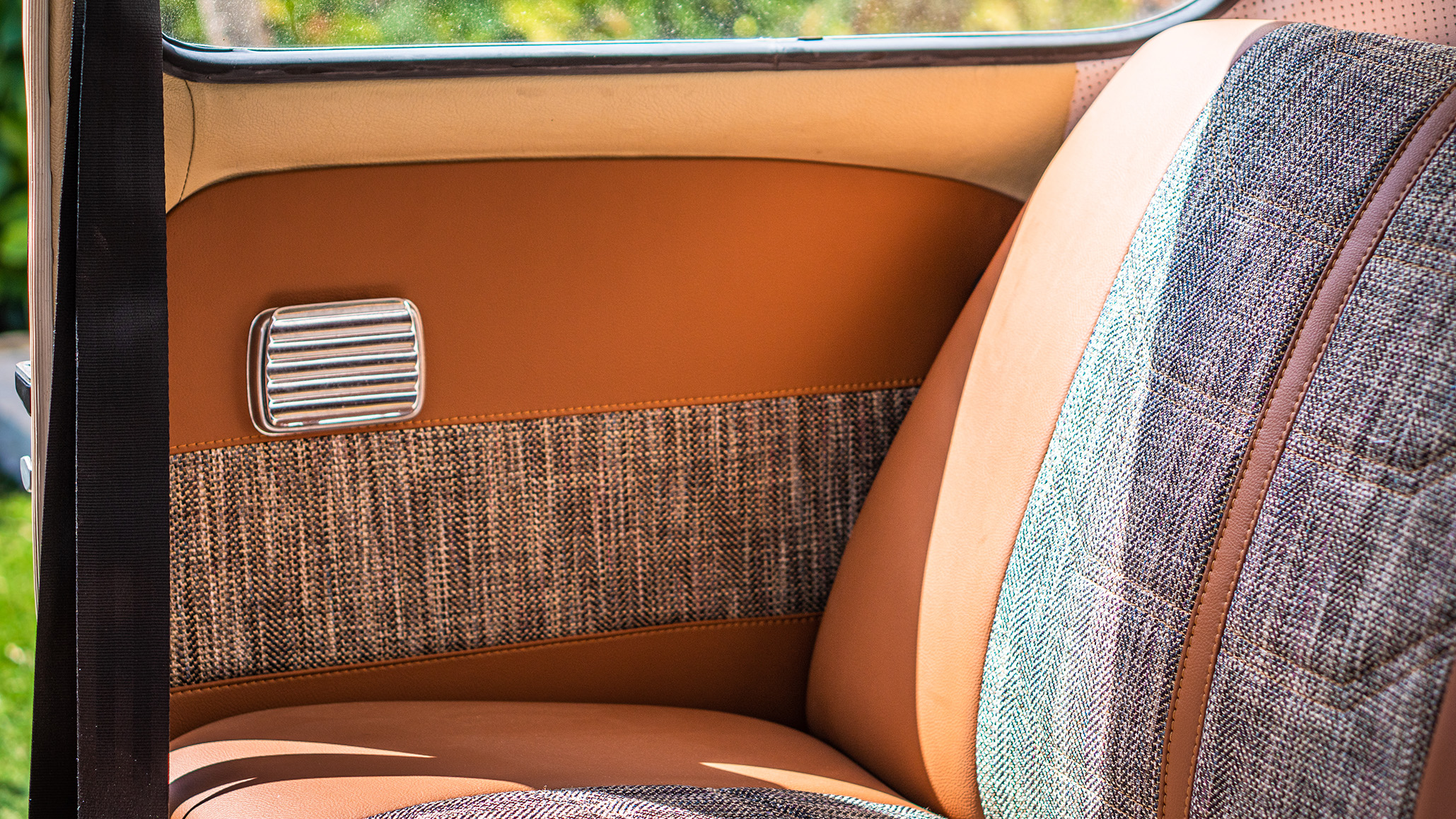 Rénovation complète de la sellerie sur cette magnifique Coccinelle 1300 de 1968 : panneaux de portes, tableau de bord, sièges avant, banquette arrière, et plage arrière avec un beau motif (photos Tim Jourda).