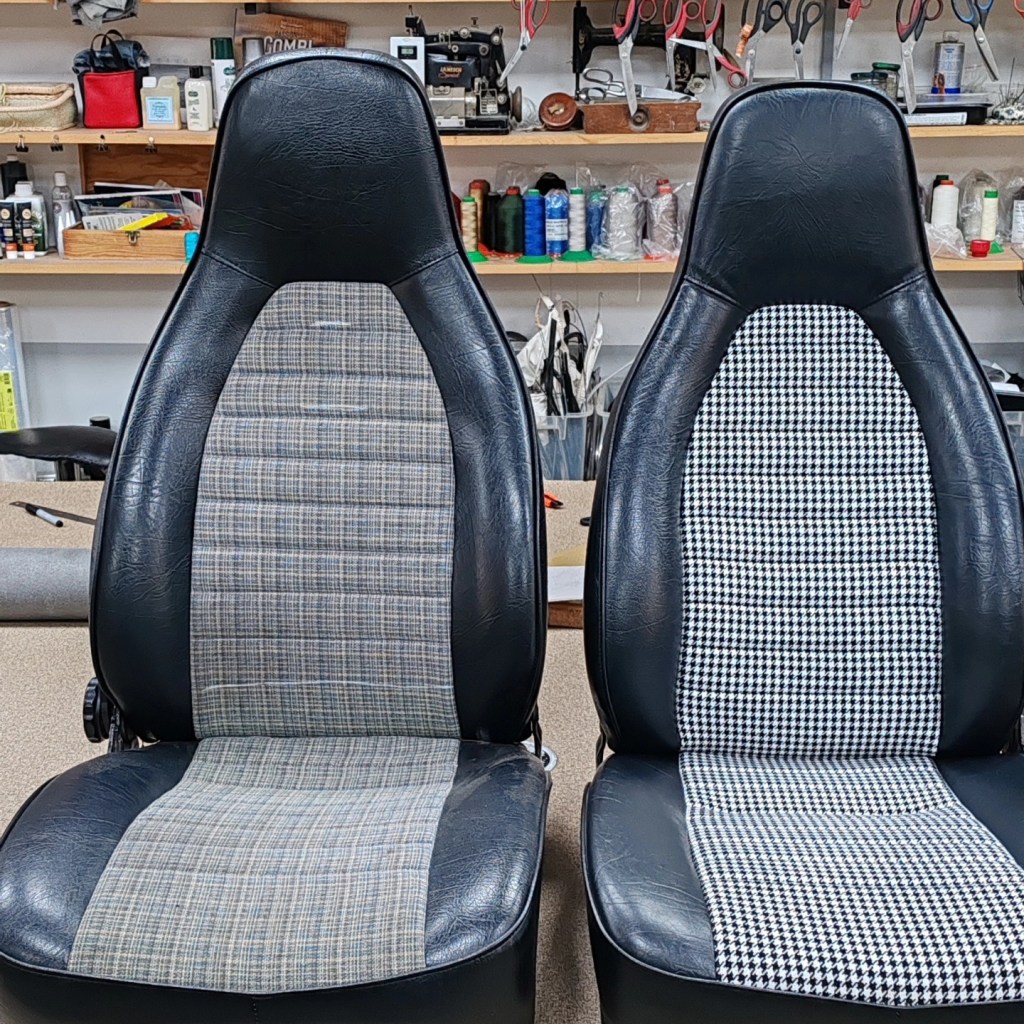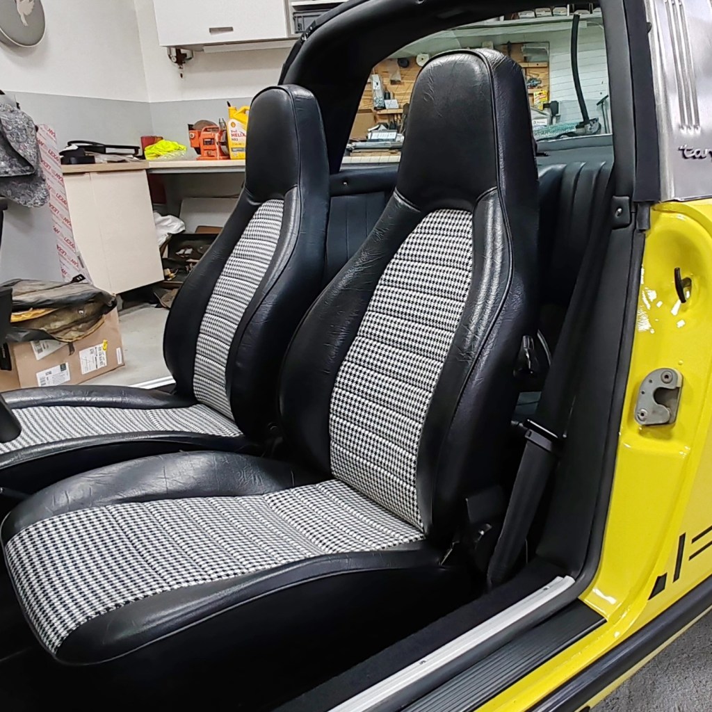 Restauration partielle des sièges avec le changement de tissu pour un pépita origine Porsche.